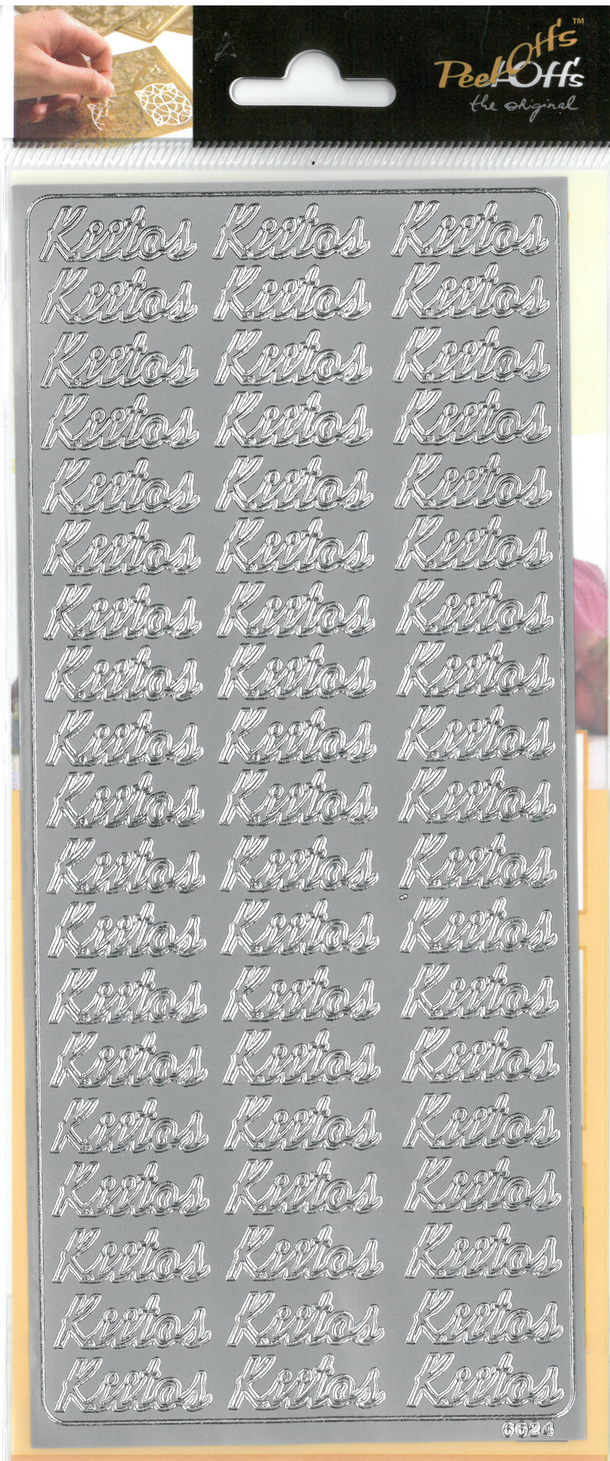 Hopeanvärinen ääriviivatarra Kiitos -tekstillä. Pakkauksessa 1 arkki, arkissa 57 tarraa. Materiaali muovi. Happovapaa. Tuotteen koko: 26,3 x 11,2cm.