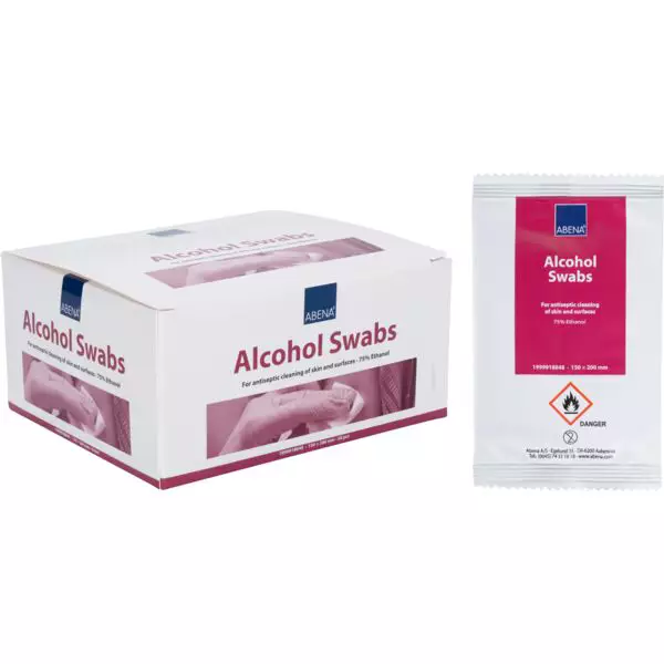 - ABENA Alcohol Swabs desinfektiopyyhkeet sisältävät 75% etanolia ja soveltuvat ihon ja pintojen antiseptiseen puhdistukseen.