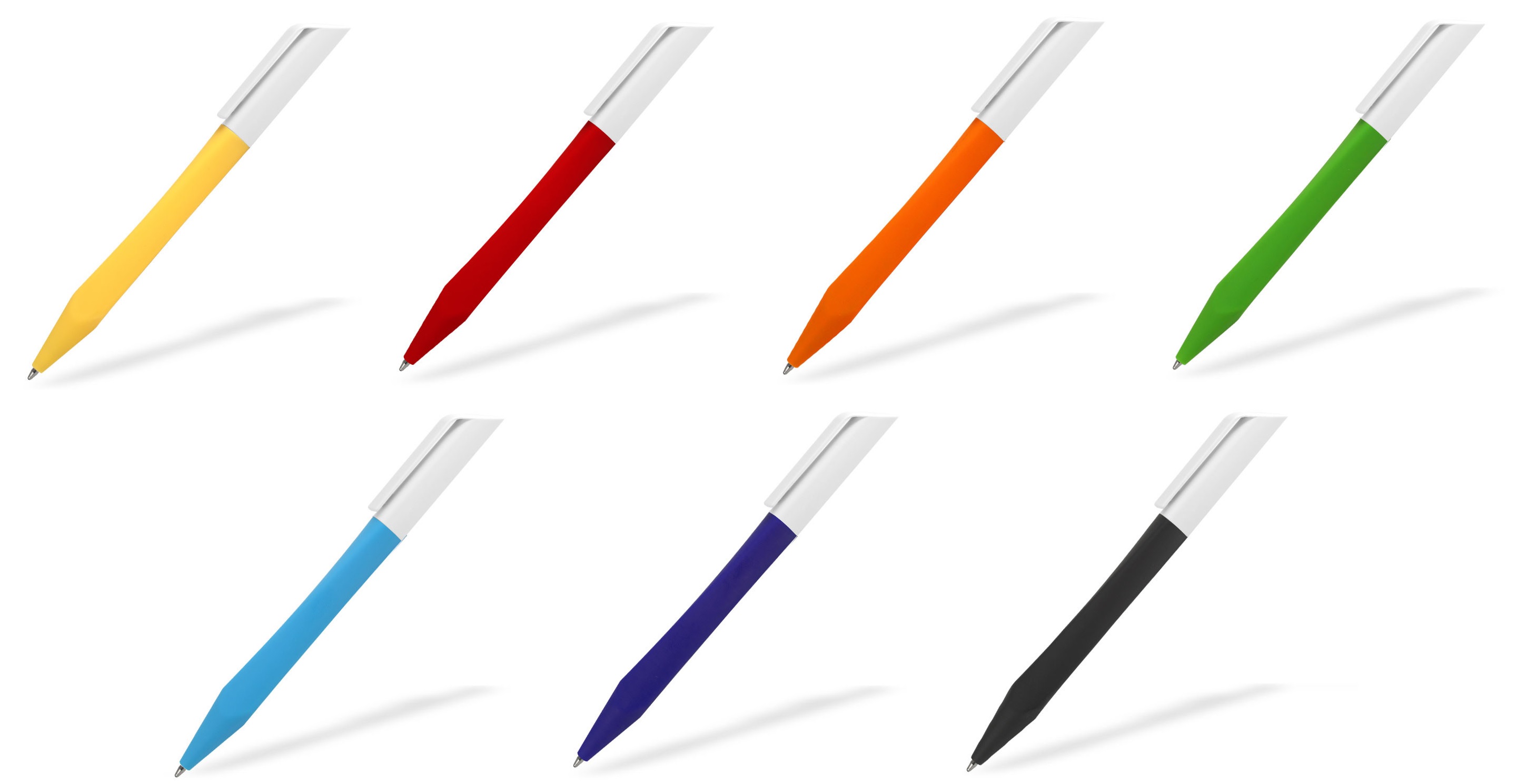Ergo kuulakynä, muotoiltu kolmikulmainen runko, kierremekanismi, sininen muste. Saatavilla 7 eri värissä, painatus valkoiseen alueeseen.