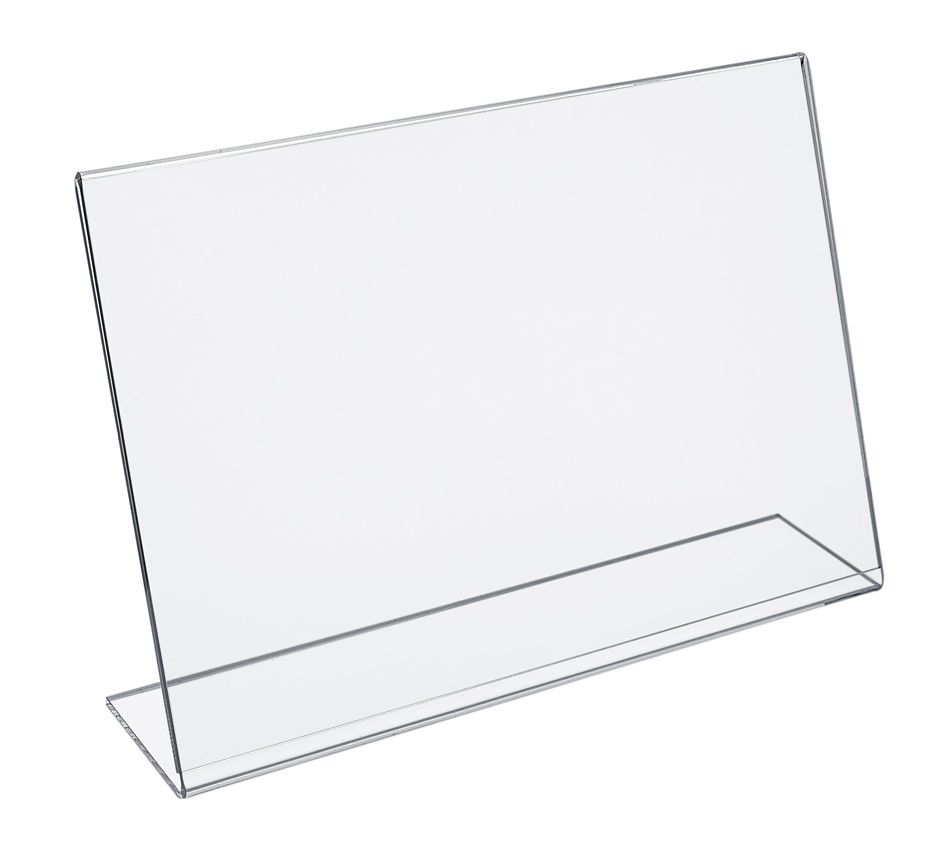 Esiteteline A4 vaaka L-malli Valmistettu kirkkaasta akryylistä. Kestävä. Mitat: Pituus: 77 mm. Leveys: 297 mm. Korkeus: 203 mm.