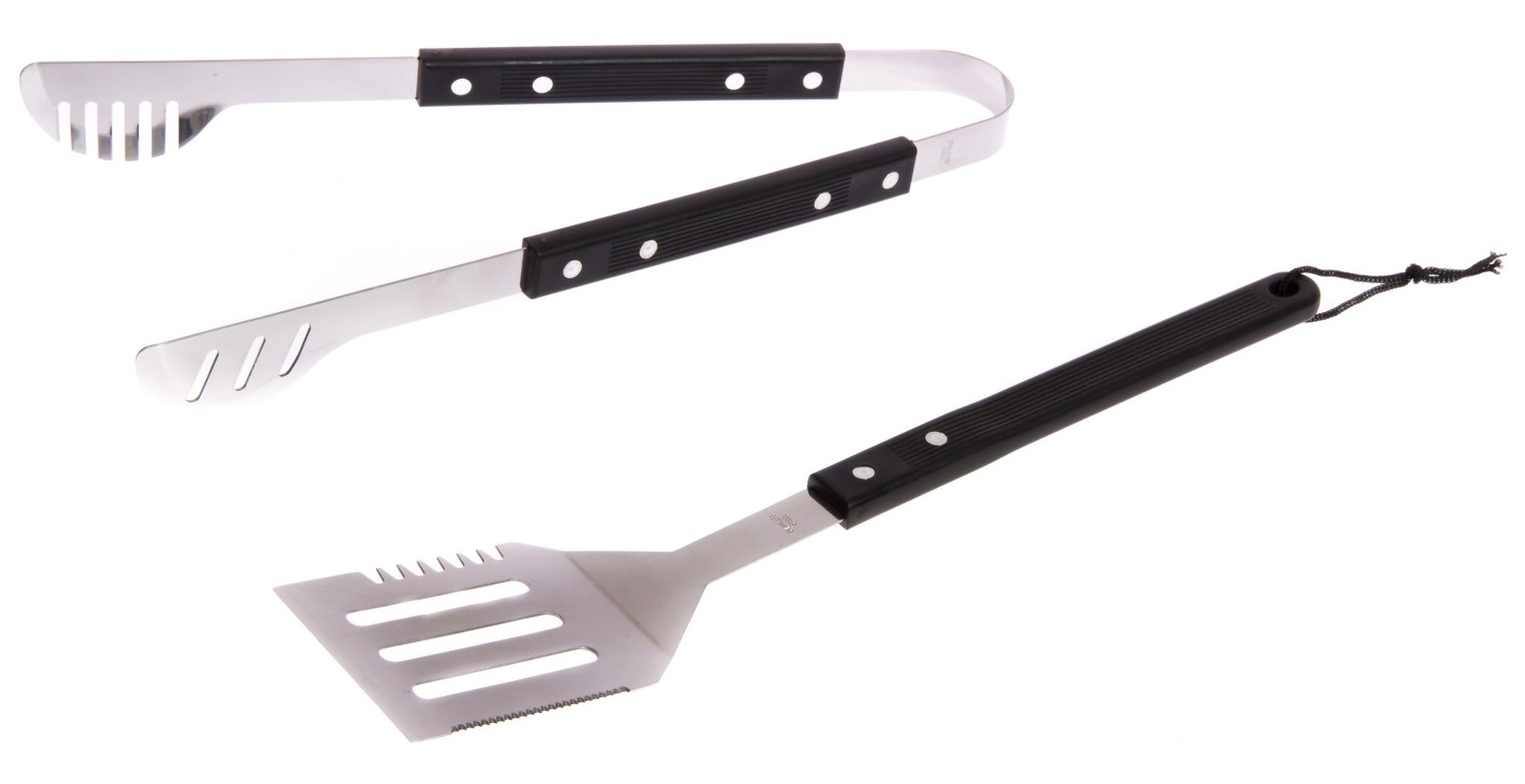 Kätevä grillaussetti pitää sisällään lastan ja pihdit. Lastassa leikkuureuna.