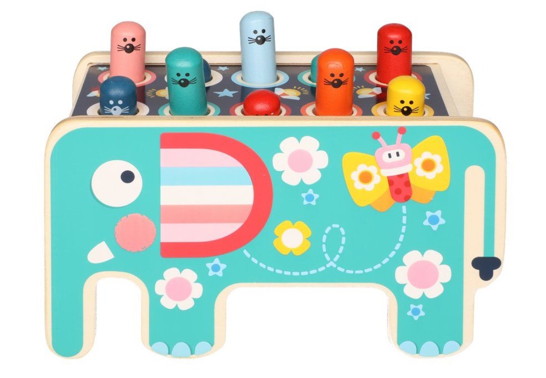 Iloisen värinen ja Elefantin muotoinen Hakka-peli. Lyö vasaralla kurkistelevia myyriä ja ponnahtavat aina takaisin ylös!