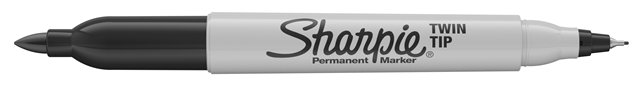Kaksi eri kokoista kärkeä yhdessä tussissa. Pysyy useimmilla pinnoilla, kuten paperissa, muovissa sekä metallissa.