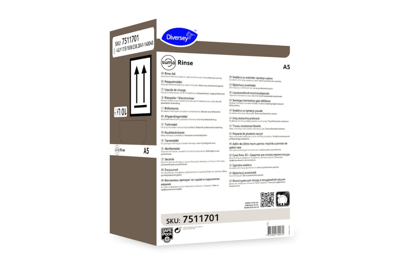 Suma Rinse A5 on neutraali huuhtelukirkaste, joka soveltuu käytettäväksi kaikentyyppisissä astianpesukoneissa. Tuote sisältää ionittomia pinta-aktiivisia aineita, joiden ansiosta astiat kuivuvat nopeasti eikä niihin jää pisaranjälkiä.