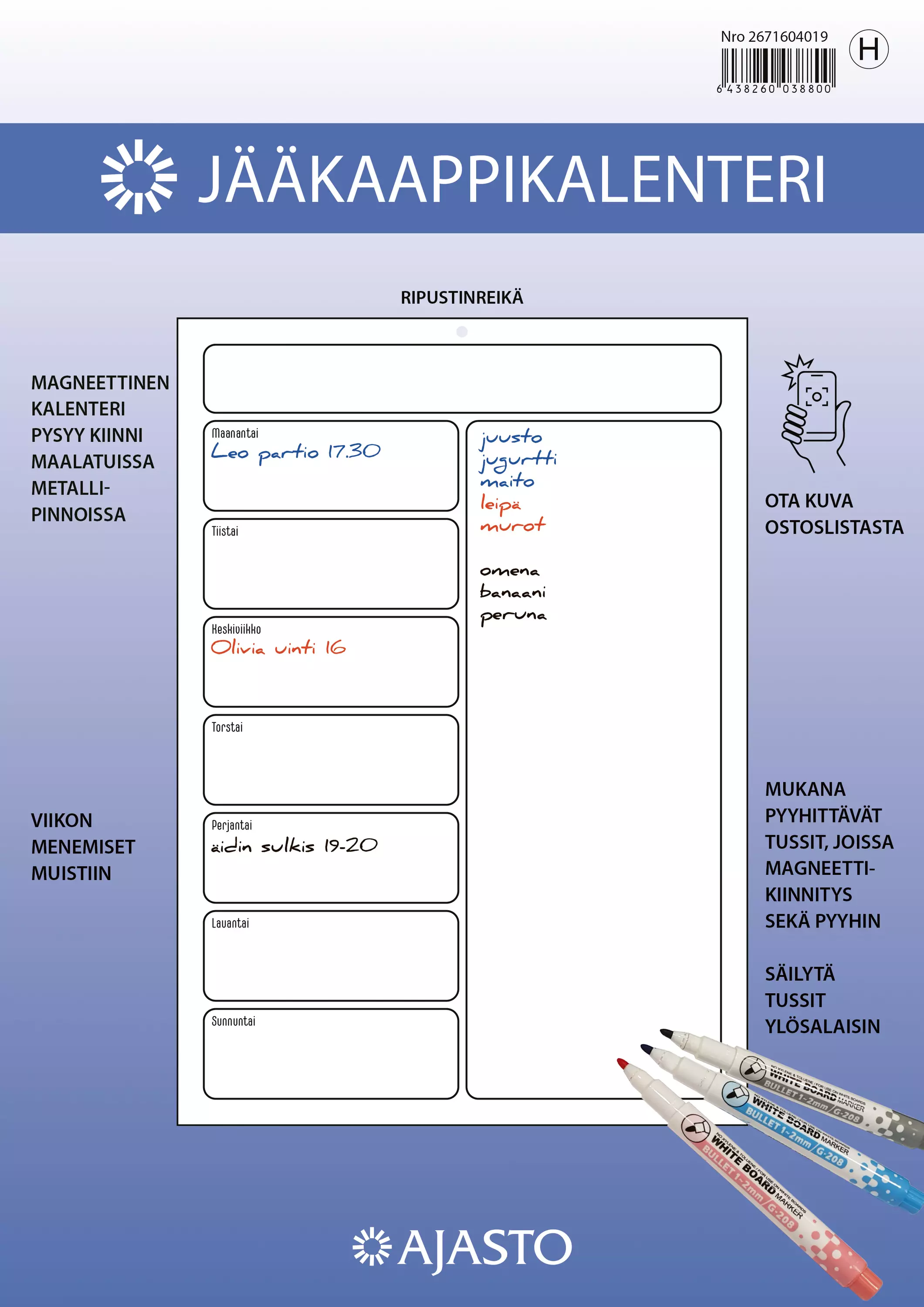 Magneettinen viikkokalenteri jääkaapin oveen. Kalenteri pysyy kiinni maalatuissa metallipinnoissa. Mukana tussit, joiden teksti on pyyhittävissä.