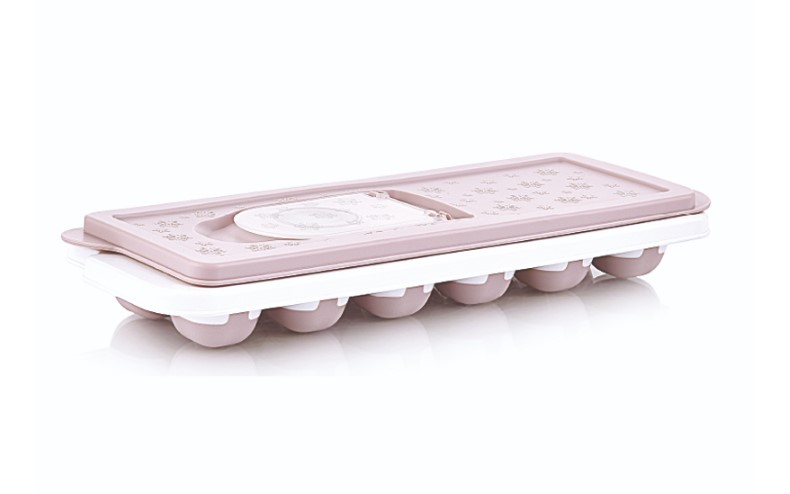Kannellinen jääpalamuotti, jonka kannessa kätevä vedentäyttöluukku. Joustavat silikonilokerot helpottavat jääpalojen irrotusta ja silikoninen kansi estää vettä läikkymästä.