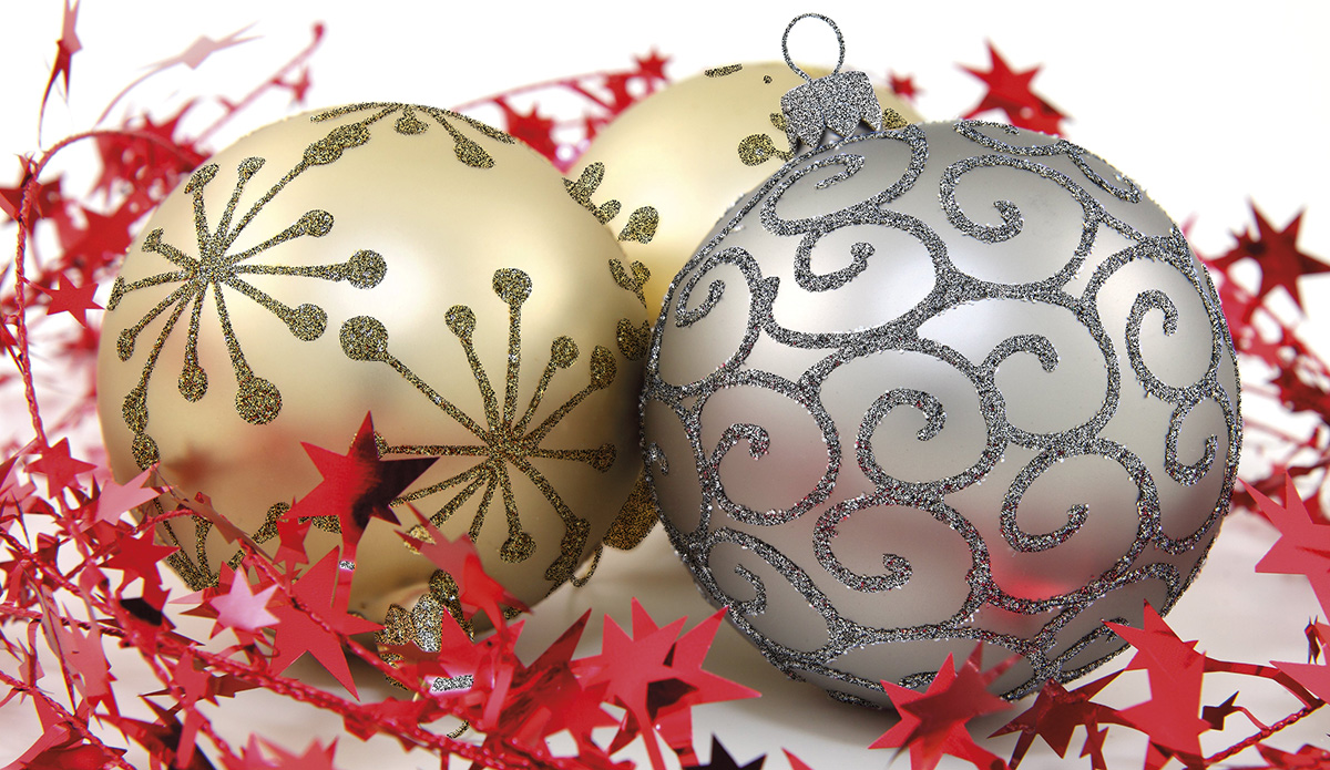 Kimalteiset joulukuusenkoristeet koristavat tätä joulukorttia.