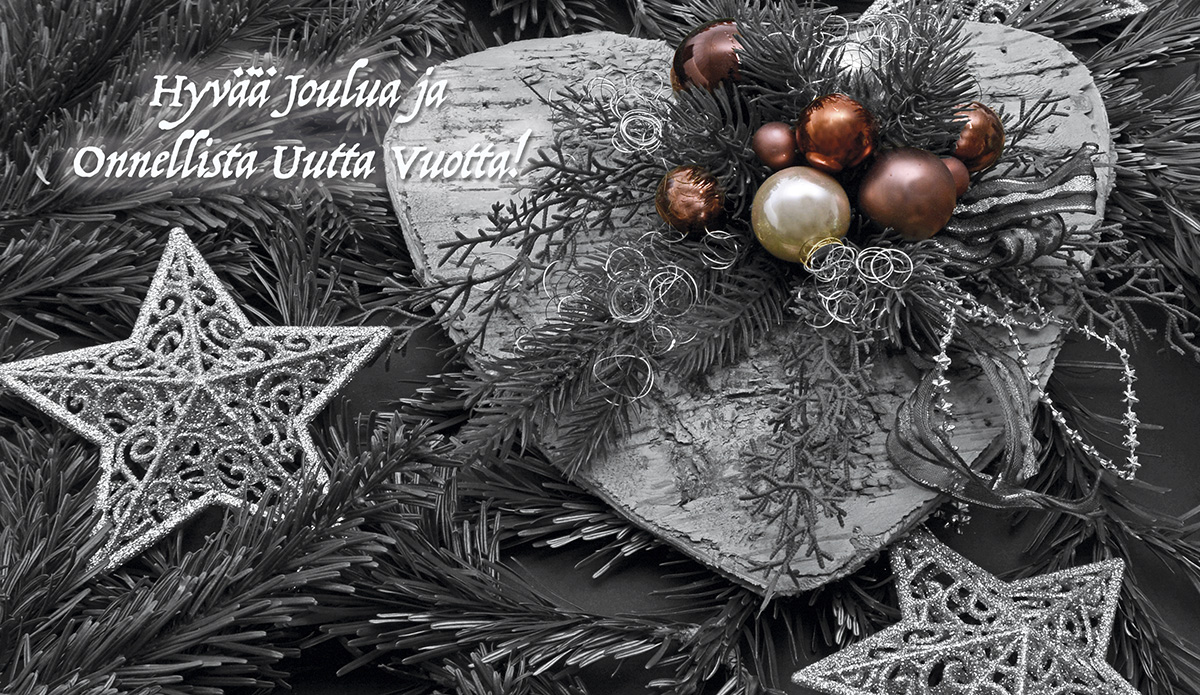 Havuteemainen joulukortti, jossa koristaa kimmeltävt tähdet ja koristeet.