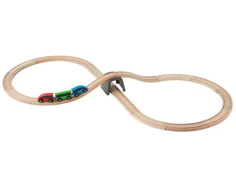 Lasten kolmiosainen puinen juna, jonka vaunut kiinnittyvät toisiinsa magneetein.