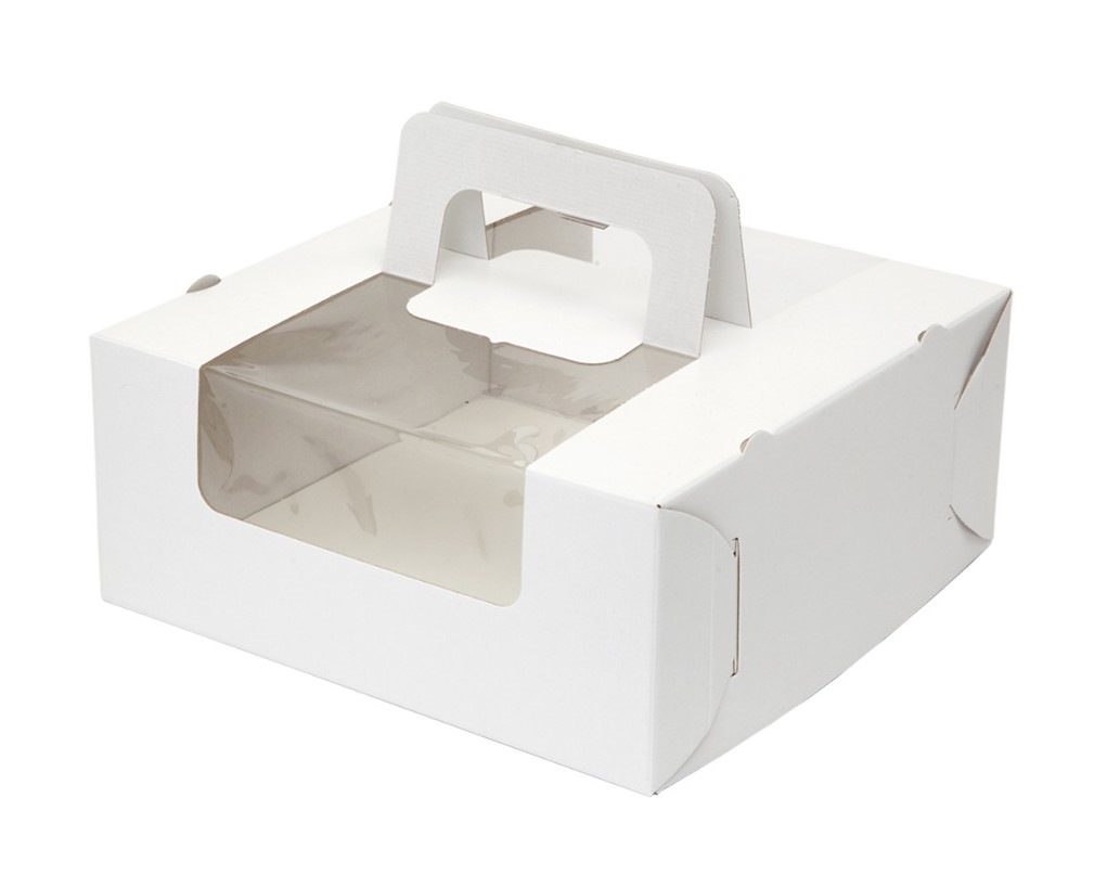 Ikkunallinen kakkulaatikko kantokahvoilla. Laatikko sisältää alustan, jonka avulla kakkua on helppo siirtää.