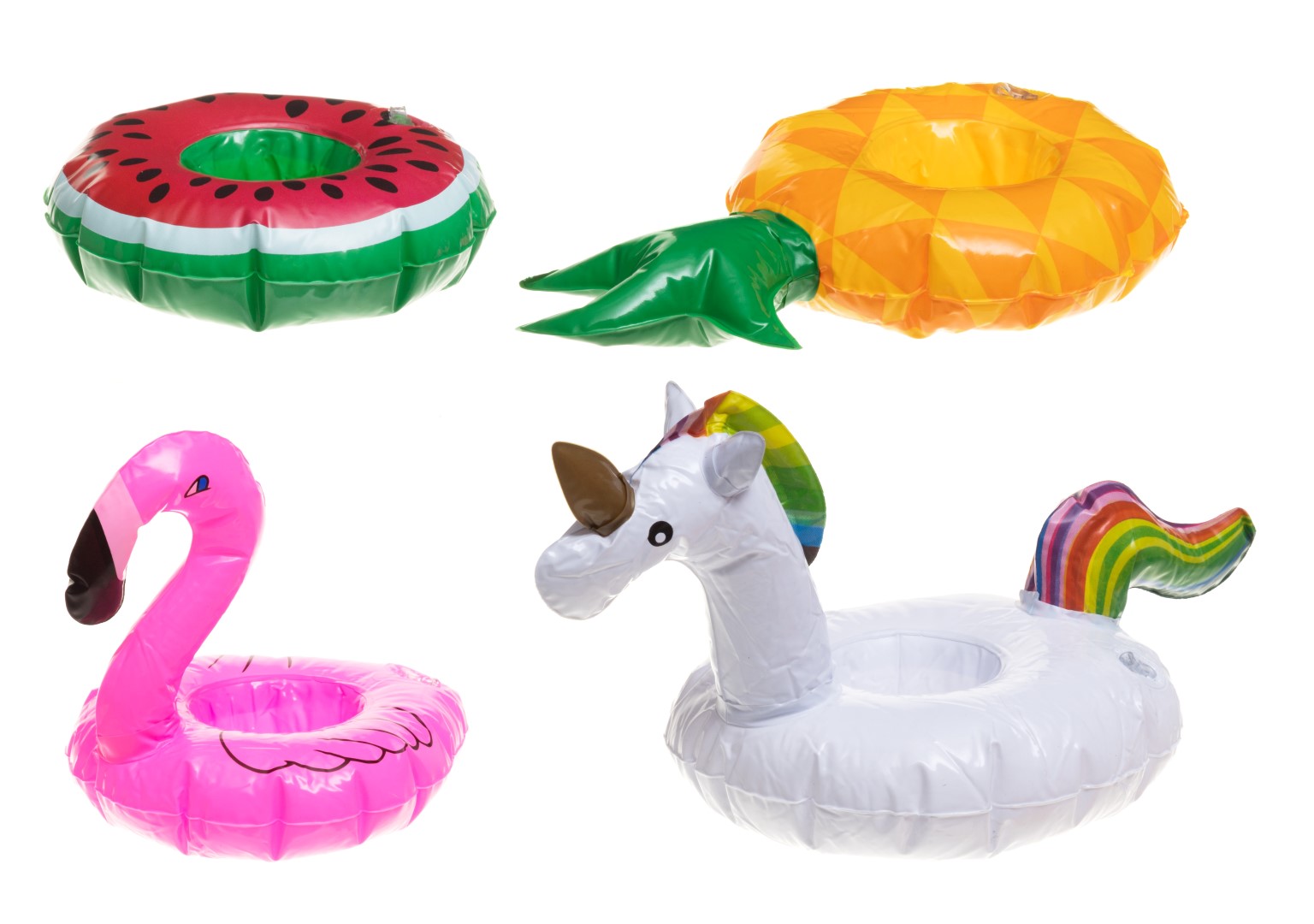 On aika paistatella päivää, uida ja nauttia kelluvista virvokkeista. Ananas, vesimeloni, flamingo ja yksisarvinen pitävät juomasi pinnalla. Nopea täyttää. Erinomainen lisävaruste rannalle, paljuun ja allasjuhliin.