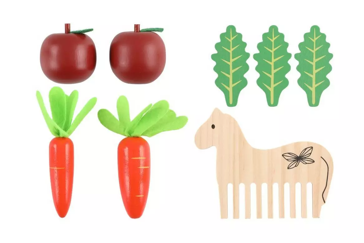 - Pakkaus sisältää 6 porkkanaa, kaksi omenaa, 3 salaattia ja suloisen hevosenmuotoisen kamman.