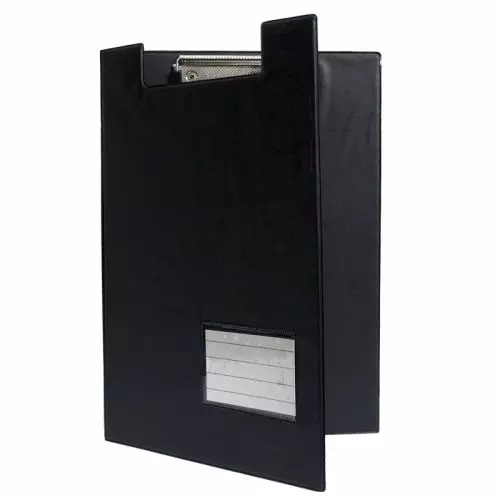 Kannellinen keräilyalusta, jossa metalliklipsi ja kolmionmallinen muovitasku. A4-kokoisille papereille.
