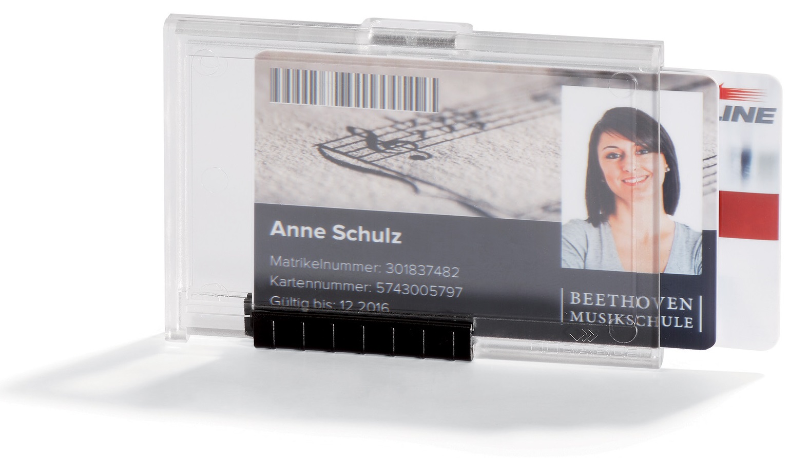 Kahden kortin (esim. nimikyltti ja magneettijuovakortti) kotelo. Hakusanat: nimikyltti, nimilappu, nimilappupidike, rintakyltti, nimikorttikotelo, henkilökorttikotelo, nimineula, käyntikorttitasku