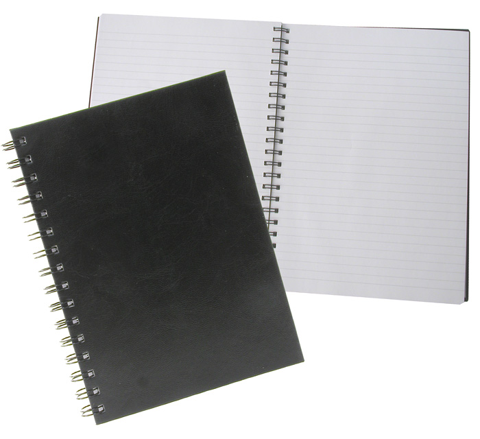 Kovakantinen, kierreselkäinen A4-kokoinen viivakirja. Hakusanat: muistikirja