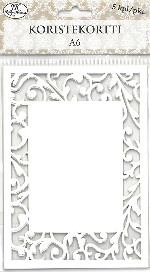 - Koristekortti Amanda laserleikatulla kuviolla. Koristekortti sopii A6-kokoisen korttipohjan päälle, jolloin korttipohja näkyy laserleikatun kuvion läpi.