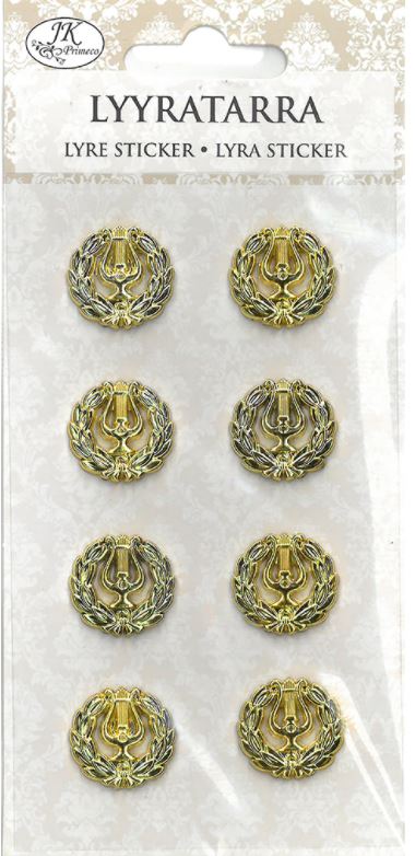 Kultainen lyyratarra askarteluun ja koristeluun. Pakkauksessa 8 tarraa. Yhden tarran halkaisija n. 2 cm. Materiaali muovi. Pakkauskoko: 16 x 8 cm.