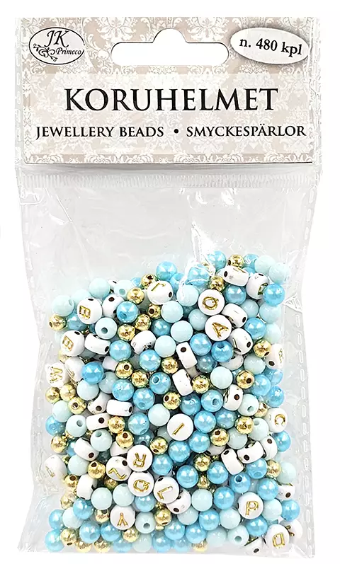 Pakkaus sisältää 50g eli noin 480 kappaletta eri kokoisia ja värisiä muovisia koru- ja kirjainhelmiä.