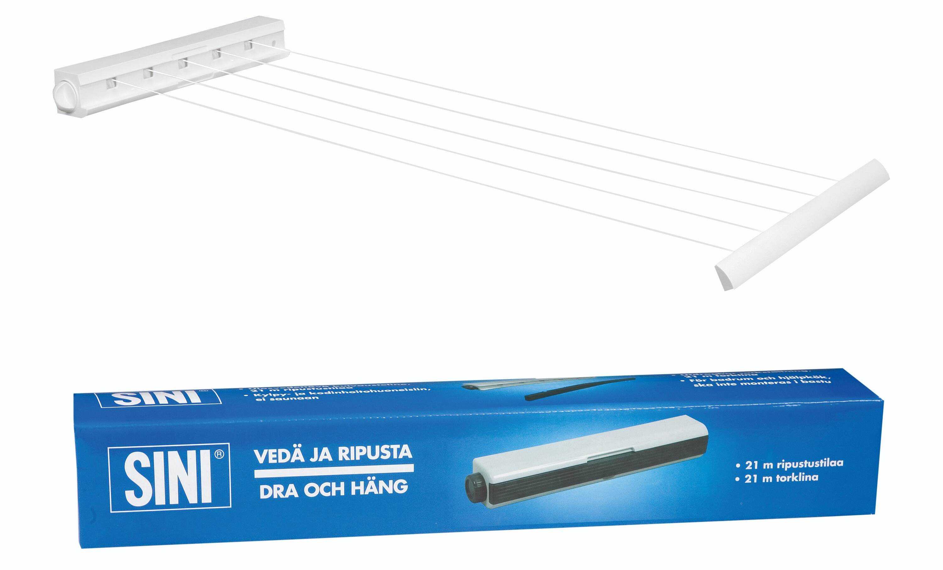 Vedä ja ripusta -kuivausteline sopii useimpiin kylpy- ja kodinhoitohuoneisiin. Kuivaustelineessä on viisi ulosvedettävää narua ja yhteensä 21 metriä kuivaustilaa. Pyykkinarut voi lukita haluttuun pituuteen. Lukitusmekanismi pitää narut kireinä. Narut saa kätevästi pois tieltä telineen sisään, kun teline ei ole käytössä.