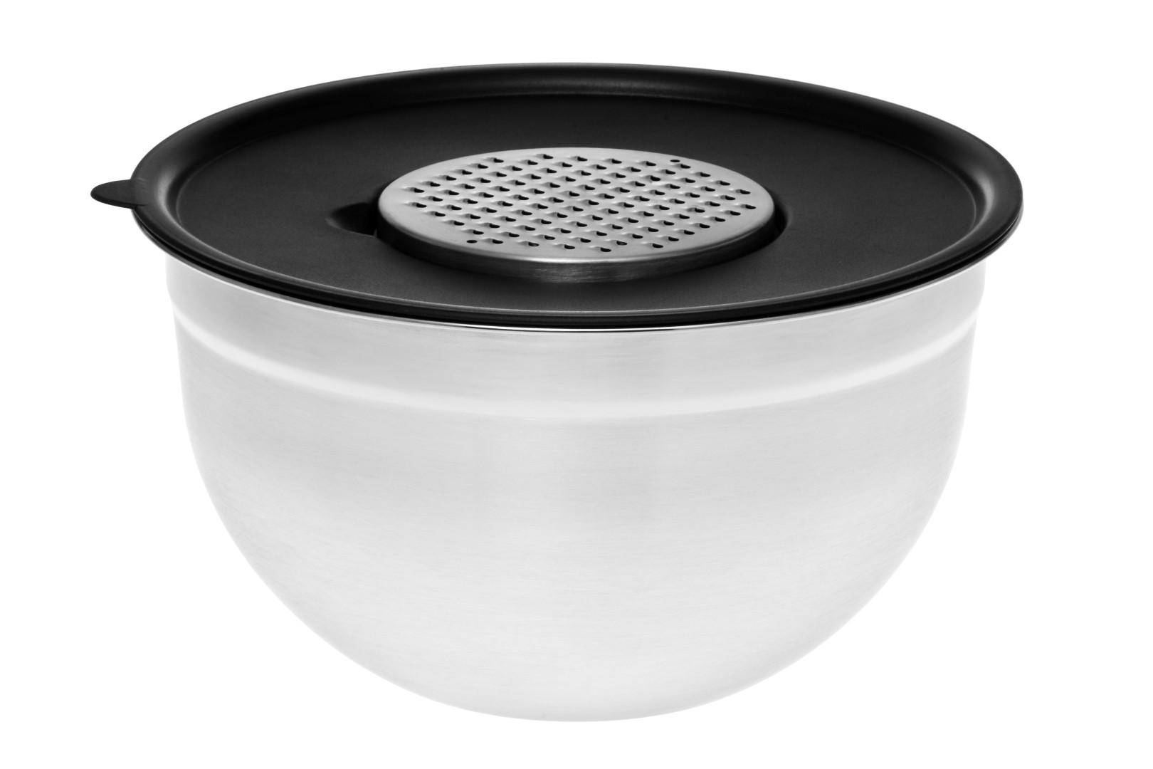 Kulho 24 x 14 cm. Ruostumatonta terästä, kansi polyeteeniä. Sisältää 20 cm lävikkö, kolme raastinta ja kulho ja kansi. Värilaatikko.