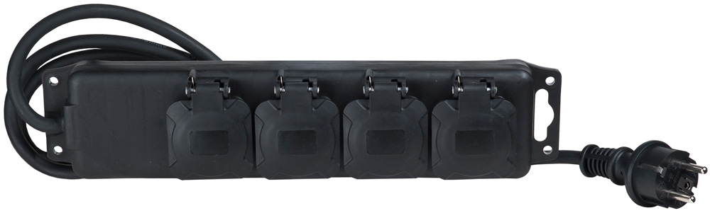 Maadoitettu kumikaapeli sisä- ja ulkokäyttöön. 4-osaisen jatkojohdon haaroitinpistorasia voidaan ripustaa seinälle.