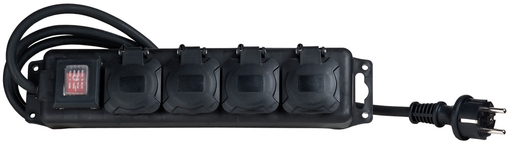 Maadoitettu kumikaapeli sisä- ja ulkokäyttöön. 4-osaisen jatkojohdon haaroitinpistorasia voidaan ripustaa seinälle.