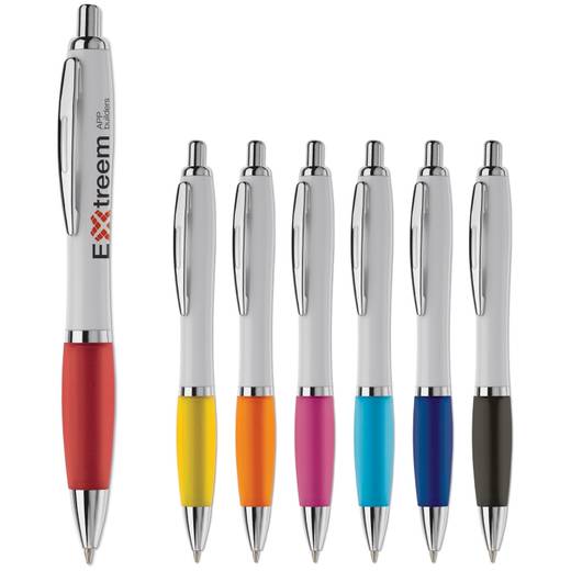 - Valkorunkoinen kuulakynä, jossa metalliosat.