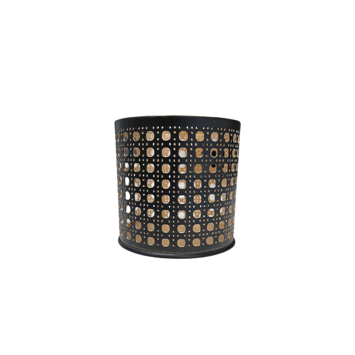 Metallinen kulta-musta kynttilälyhty, jonka läpi kynttilän valo siivilöityy kauniisti.
