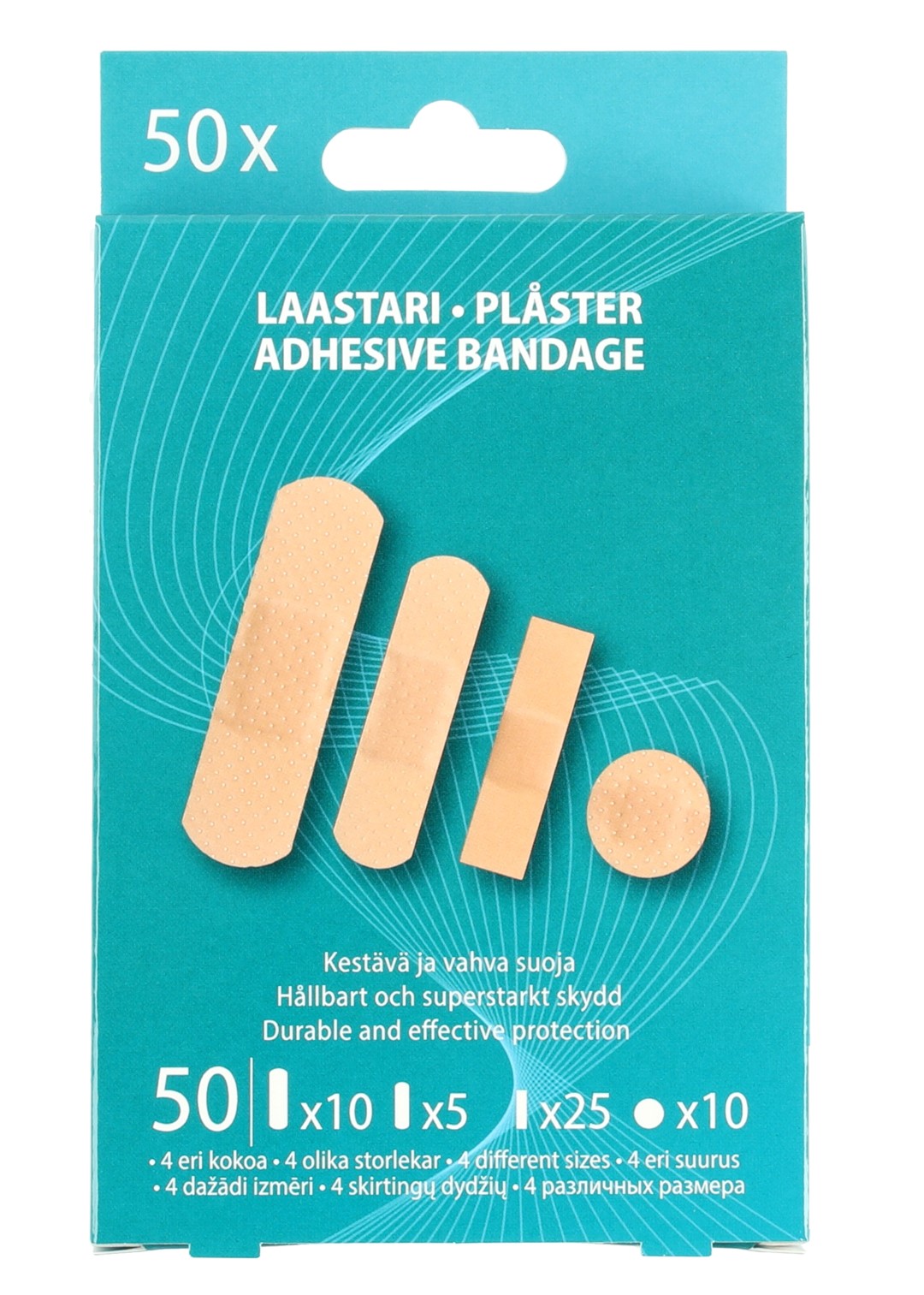 Hengittävä ja vedenpitävä. Pakkauksessa yhteensä 50 laastaria, neljässä eri koossa.