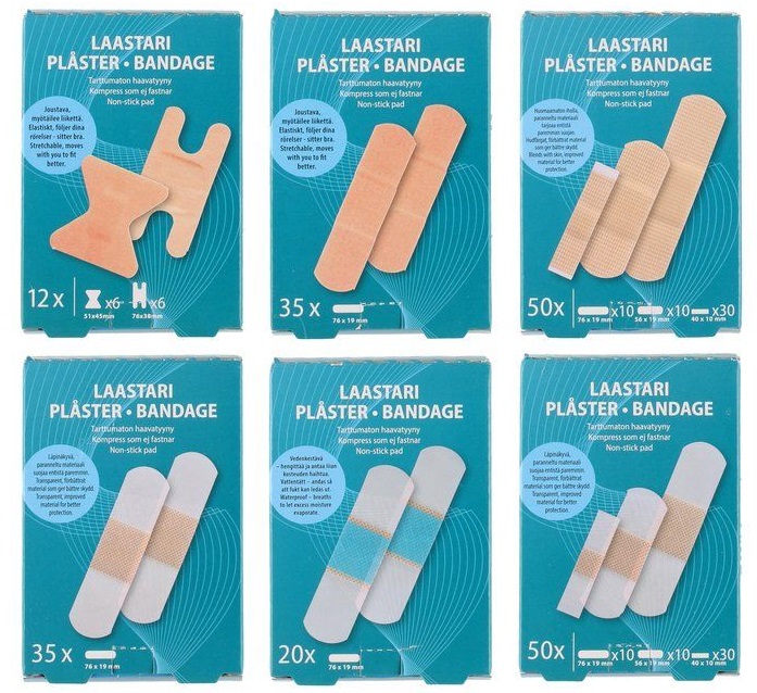 - Valittavana kuusi erilaista laastaripakettia (kuvan järjestyksessä; vasemmalta oikealle, ylhäältä alas):