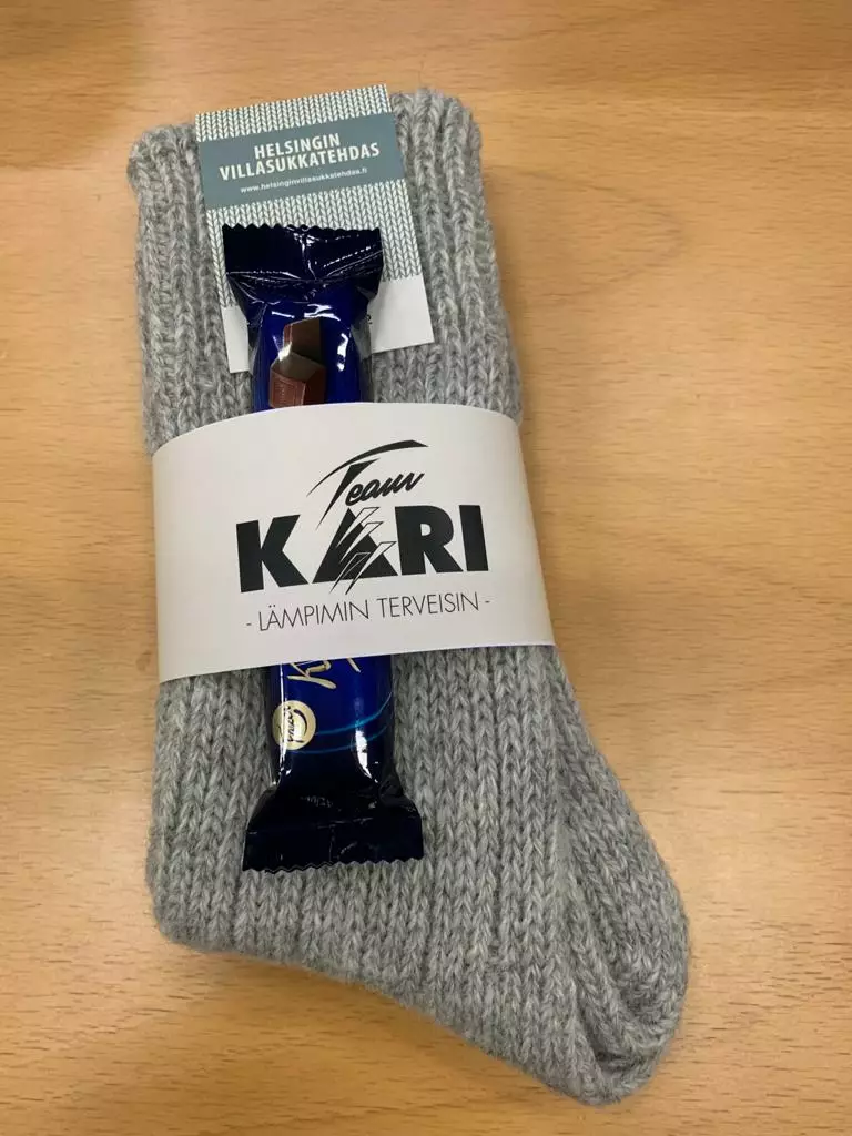 Kotimaisen Helsingin Villasukkatehtaan villasukat sekä Fazerin sininen -suklaapatukka. Vyötteen painatus tehdään Suomessa. Muista vaikkapa henkilökuntaasi tällä kokonaan kotimaisella ja... Lue lisää