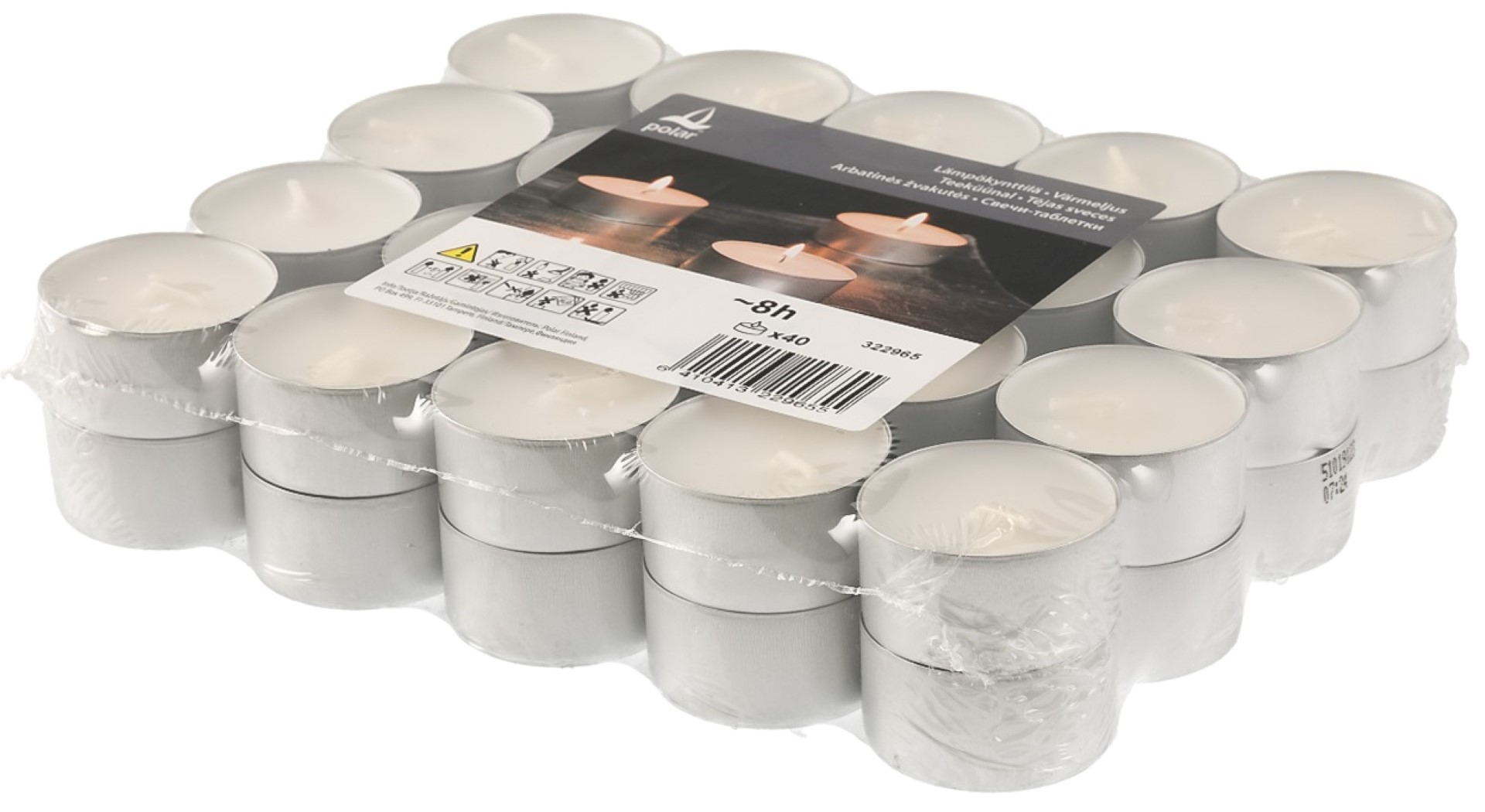 Koko: 3,9 x 3,9 x 2,15 cm. Alumiinikippo, sekoitus parafiinia ja palmusteariinia. Paloaika n. 8h. 40 kpl / pakkaus.