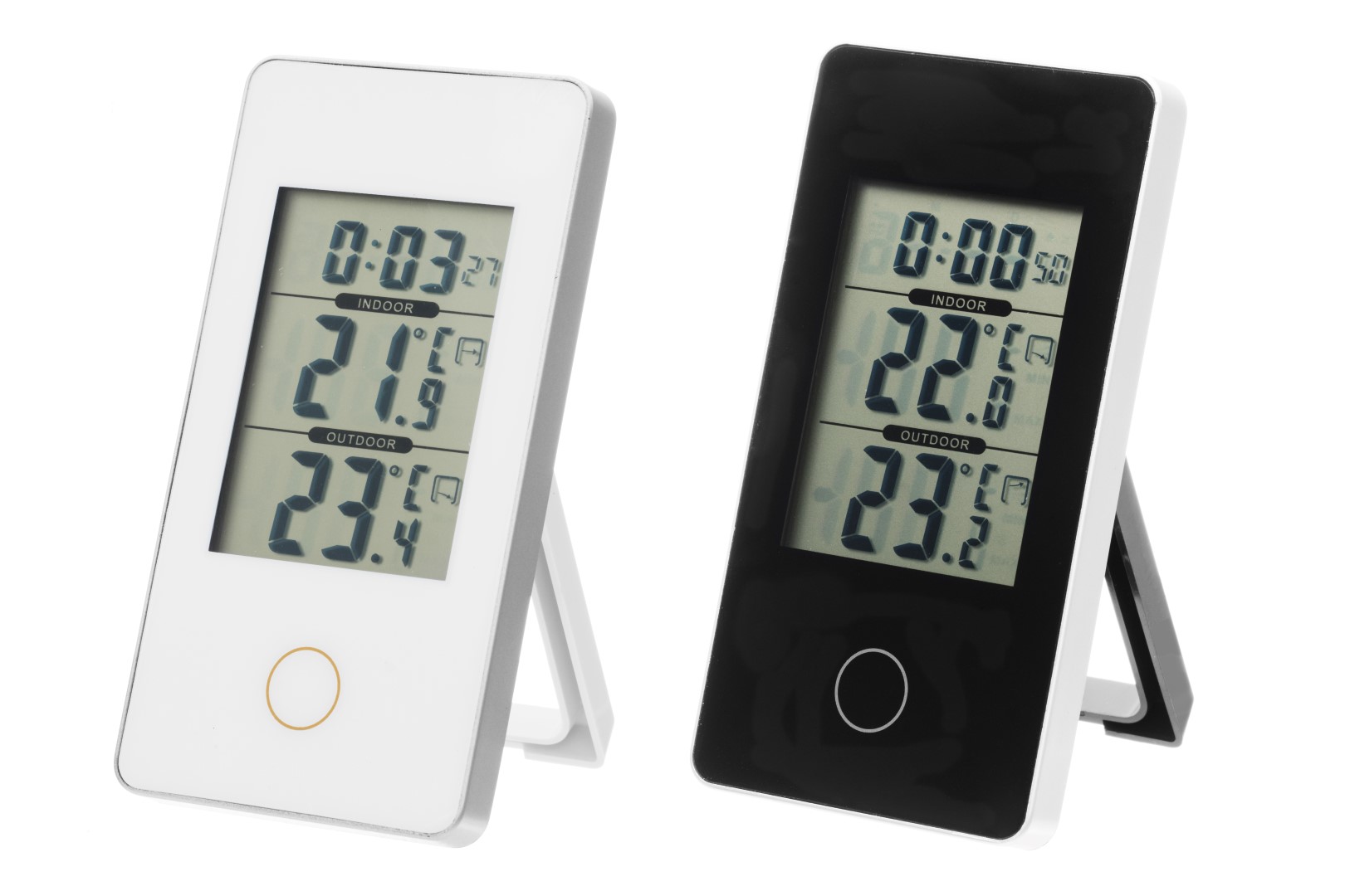 Musta ja valkoinen. Digitaalinen lämpömittari modernilla designilla sisä- ja ulkolämpötilan mittaukseen. Kello, päiväys sekä hälytystoiminnot. Ulkolämpötilaa mittaava sensori johdon päässä. Mittausalue sisälämpötilalle 0-50°C ja ulkolämpötilalle -50-70°C. Celsius ja Fahrenheit valittavissa. 2xAAA paristot sisältyvät.