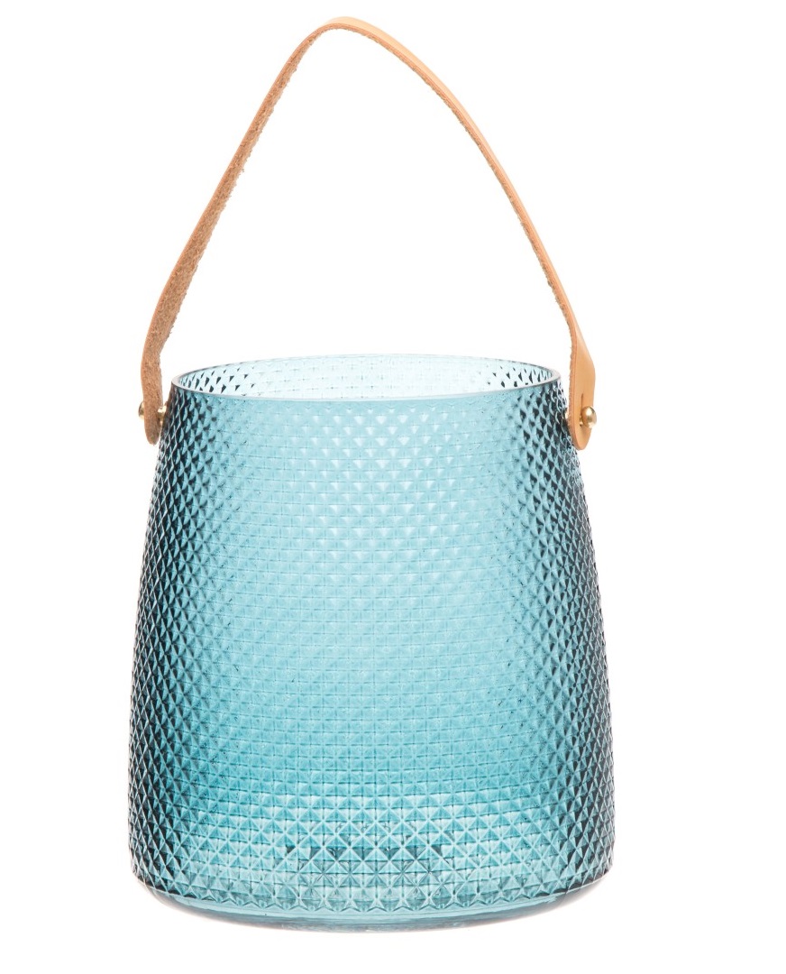 17,5 x 17,5 x 19 cm. Keinonahkaremmi (PU). Petroolinsininen lasimaljakko taittaa kauniisti valon leikitellen sinisen ja vihreän eri sävyillä. Yksityiskohtana kaunis keinonahkaremmi.
