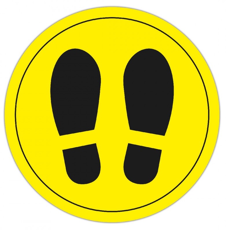 - Pyöreä keltainen tarra mustilla kengänpohjakuviolla.