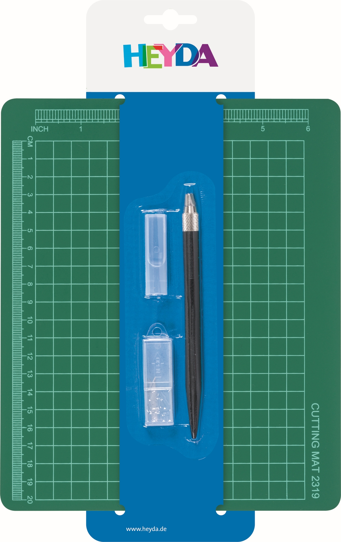 Askartelusetti sisältää leikkuualustan, veitsen ja 6 vaihtoterää. Alusta 3 mm paksua erikoismuovia.