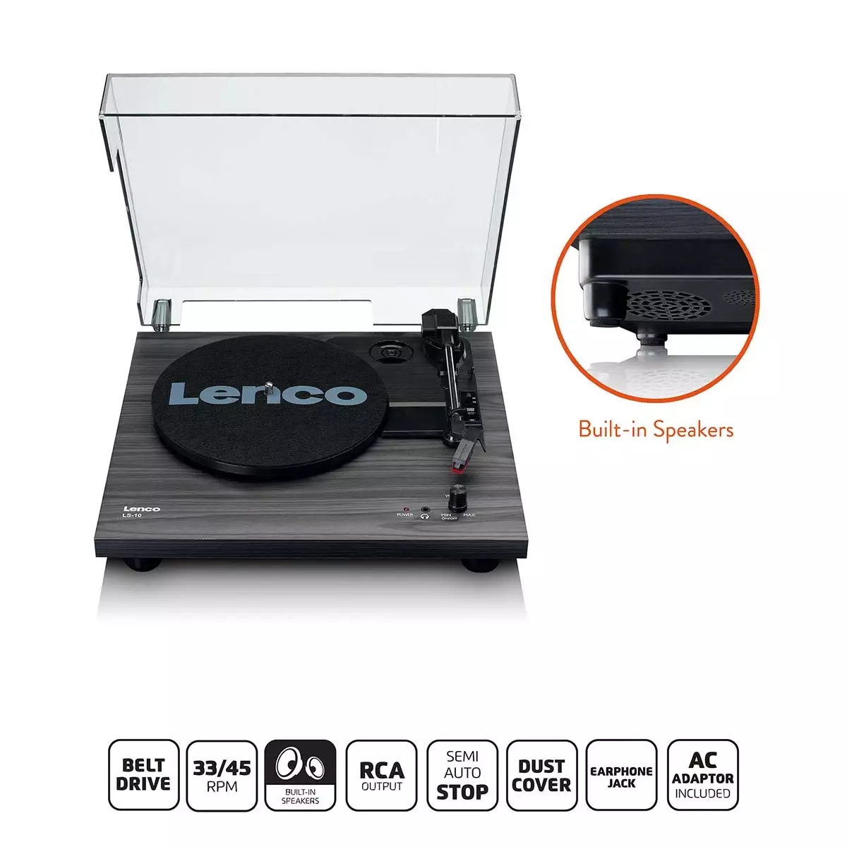 Lenco LS-10BK on moderni levysoitin, jossa on kaksi sisäänrakennettua kaiutinta. Nauti suosikkivinyyleistäsi napin painalluksella. Unohda monimutkaiset musiikkijärjestelmät, sillä Lenco LS-10 herättää levysi vaivattomasti henkiin. Kuuntelitpa mitä musiikkia tahansa, voit helposti vaihtaa 33 kierroksen kierroksesta 45 kierrokseen. Jos haluat lisää äänenvoimakkuutta, käytä ulkoisia kaiuttimia levysoittimen takana olevan RCA-liitännän kautta. Näin jokainen huone täyttyy musiikista. Levysoittimessa on myös lähtö kuulokkeille, joten voit kuunnella suosikkimusiikkiasi ilman, että kukaan muu kuulee sitä.