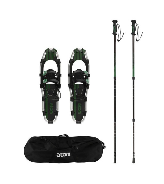 Kevyet alumiinirunkoiset lumikengät pikakiinnittyksellä, teleskooppisauvat (100-135 cm) sompapäillä sekä kantolaukku. Maksimi painosuositus 120 kg.