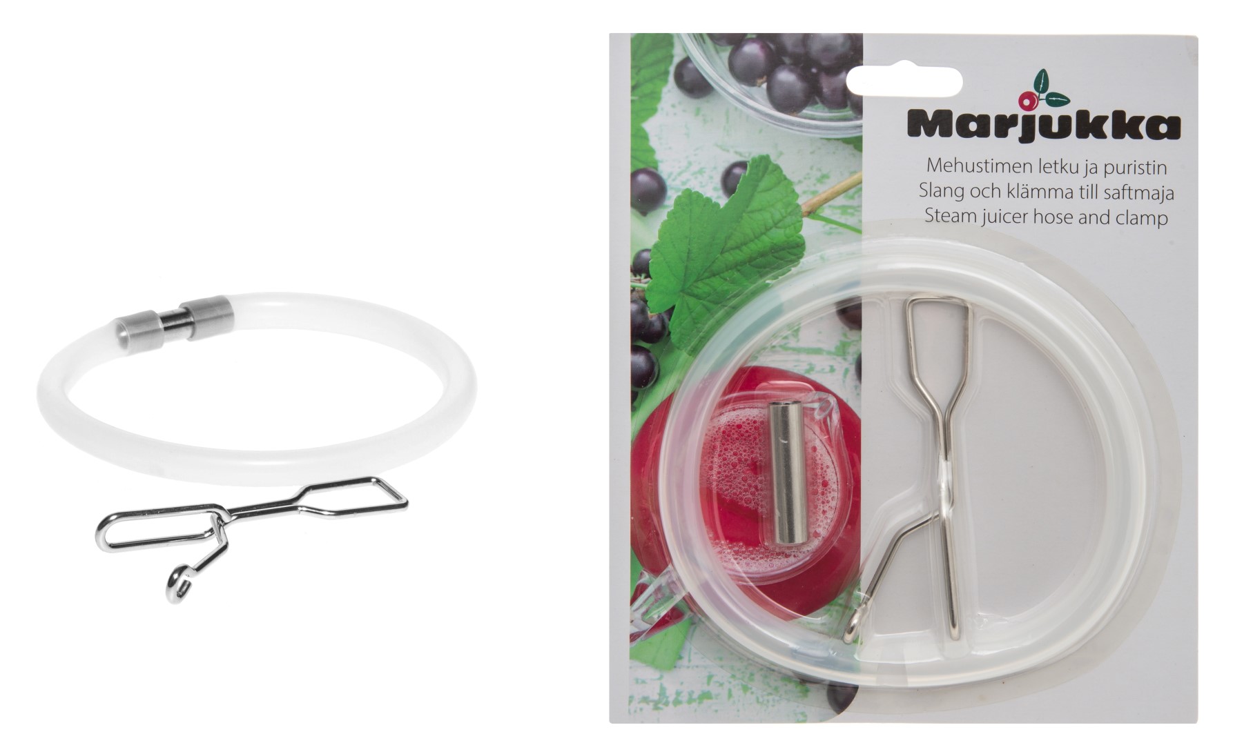 Elintarvikekelpoinen letku mehustimeen sekä letkun puristin.