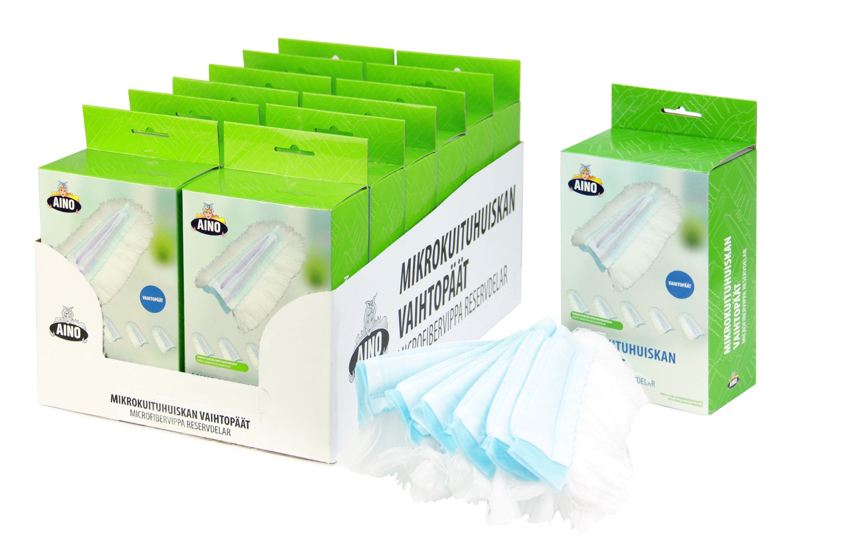 Aino mikrokuituhuiska on tehokas irtolian ja pölyn puhdistaja. Tuote ei naarmuta tai nukkaa. Sopii myös herkille pinnoille. Taittuvan kädensijan ansiosta tuote säästää tilaa säilytyksen aikana. Pakkauksessa on kuusi vaihtopäätä. Varsi myydään erikseen.