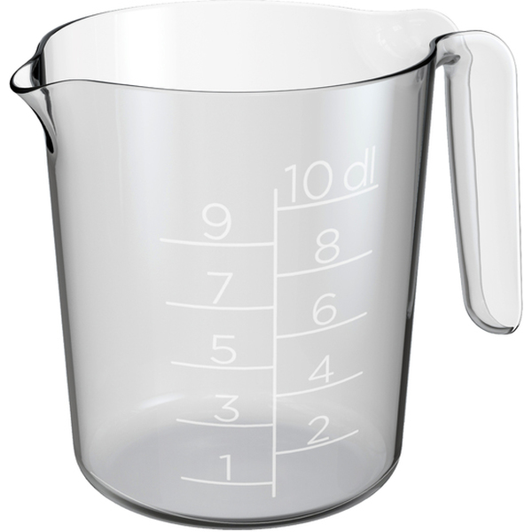 Modern läpinäkyväi mittakannu, jossa selkeä mitta-asteikko. Hakusanat: 100ml, 1000 ml, 100 cl, 100cl, 10dl, 10 dl, mitta, desimitta, litramitta