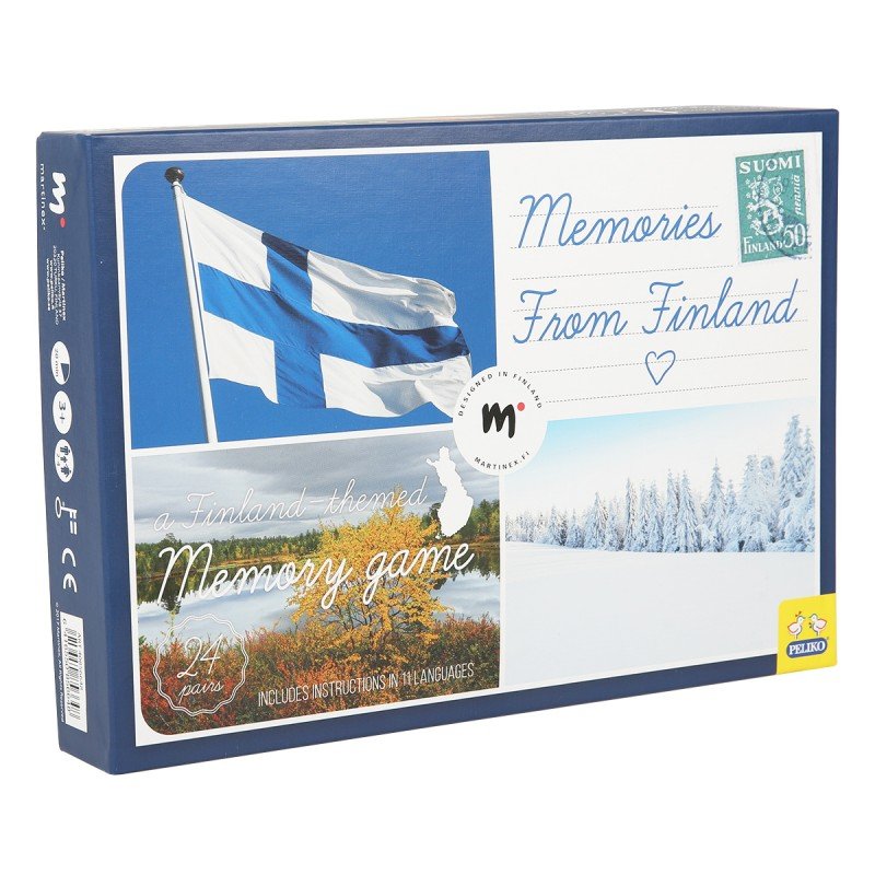 Perinteinen muistipeli, jossa on 24 paria kauniita Suomi-aiheisia kuvia. Peli on pakattu laatikkoon, ja pelin parissa viihtyvät sekä lapset että aikuiset.