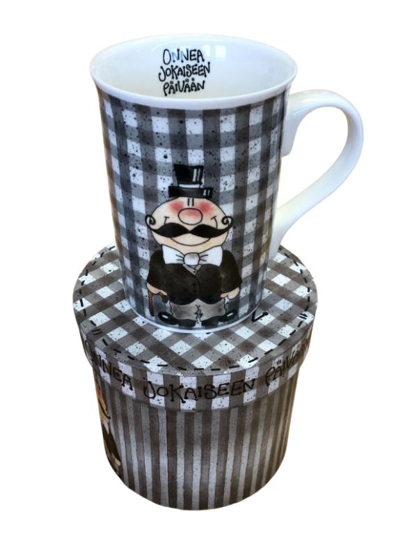 Posliinimuki kartonkisessa lahjapakkauksessa. Mukissa ja pakkauksessa teksti "Onnea jokaiseen päivään".