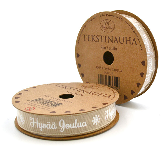 Kankainen nauharulla Hyvää joulua -tekstillä. Nauhan leveys 1,5 cm ja pituus 5 m.