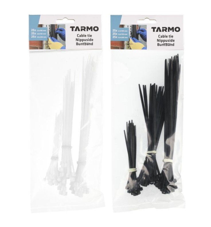 Tarmo nippusidepakkaus sisältää kolmen kokoisia nippusiteitä, kutakin kokoa 25 kpl, yhteensä siis 75 kpl nippusiteitä.