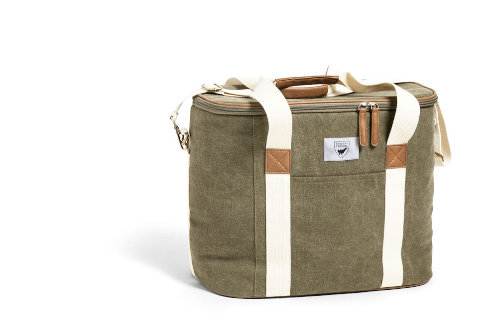 Orrefors Hunting. Kylmälaukku on vahvaa kangasta, säädettävä olkahihna ja kantokahva. Eristetyssä osiossa ruoka pysyy kylmänä koko matkan ajan. Yksityiskohdat ovat PU-nahkaa. Tilavuus 27 L.
