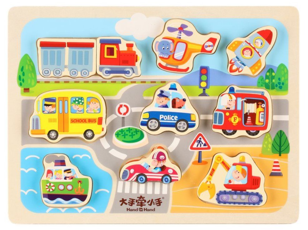 Puusta valmistettu iloisen värinen palapeli auttaa lasta harjoittamaan koordinaatiota, hahmottamaan erilaisia muotoja sekä tunnistamaan ajoneuvoja.