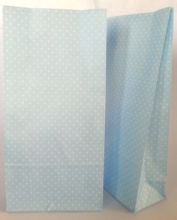 Vaaleansininen paperinen lahjapussi pallokuviolla. Yhden pussin koko 28,5cm x 14cm x 7cm. 5kpl/pkt.