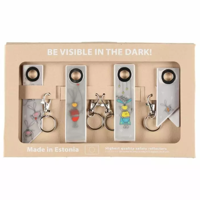 - neljä suorakaiteen muotoista pehmoheijastinta erilaisilla jäniskuvioilla