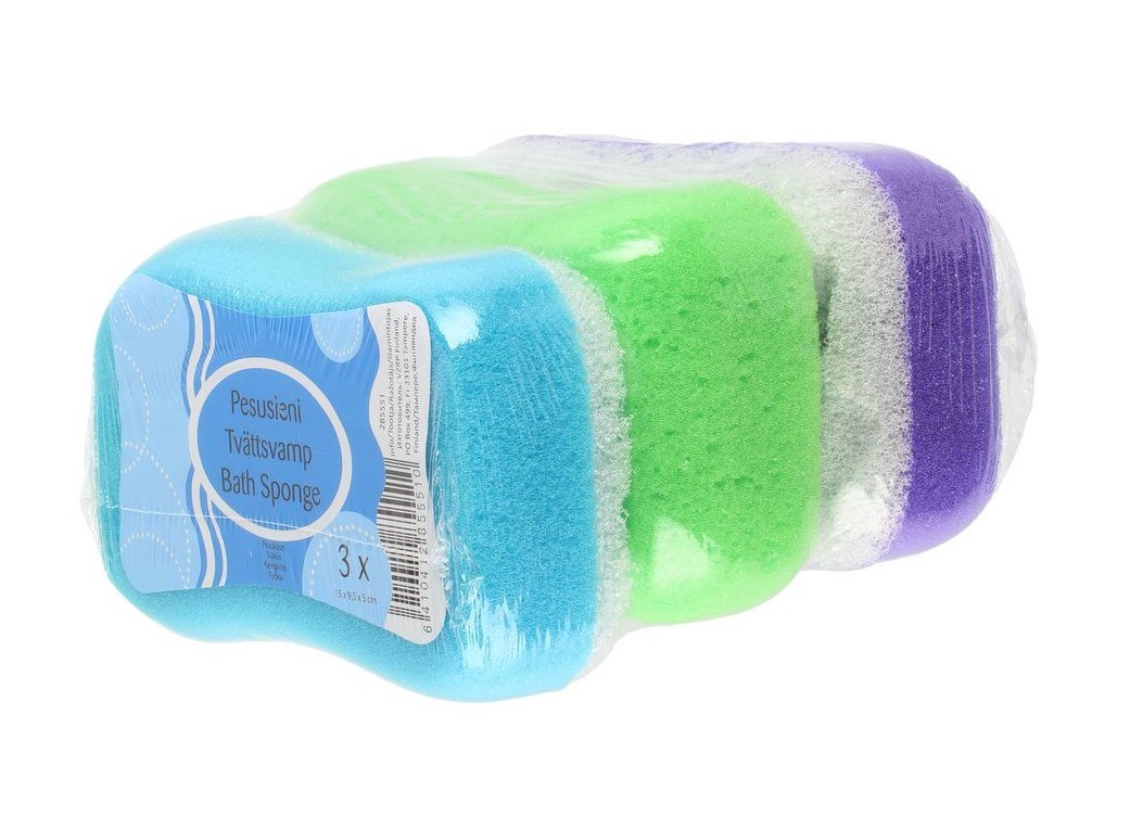 Kolmen erivärisen pesusienen setti. Pakkauksessa violetti, vihreä ja turkoosi pesusieni.
